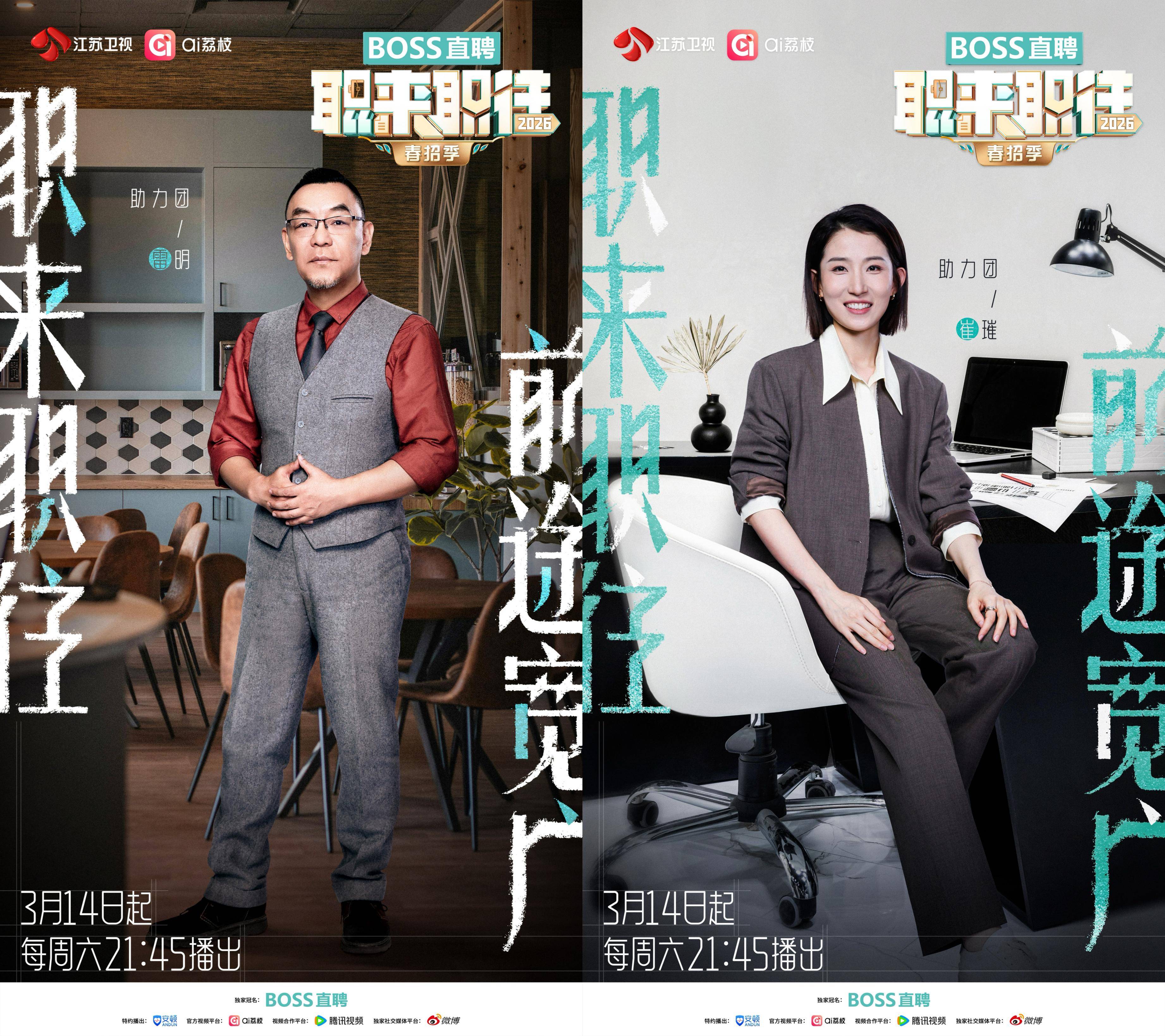 3月14日起,每周六晚21:45,敬请锁定江苏卫视、ai荔枝、腾讯视频,《BOSS直聘·职来职往2026》邀你共赴职场新约,见证每一位求职者闪闪发光的瞬间!