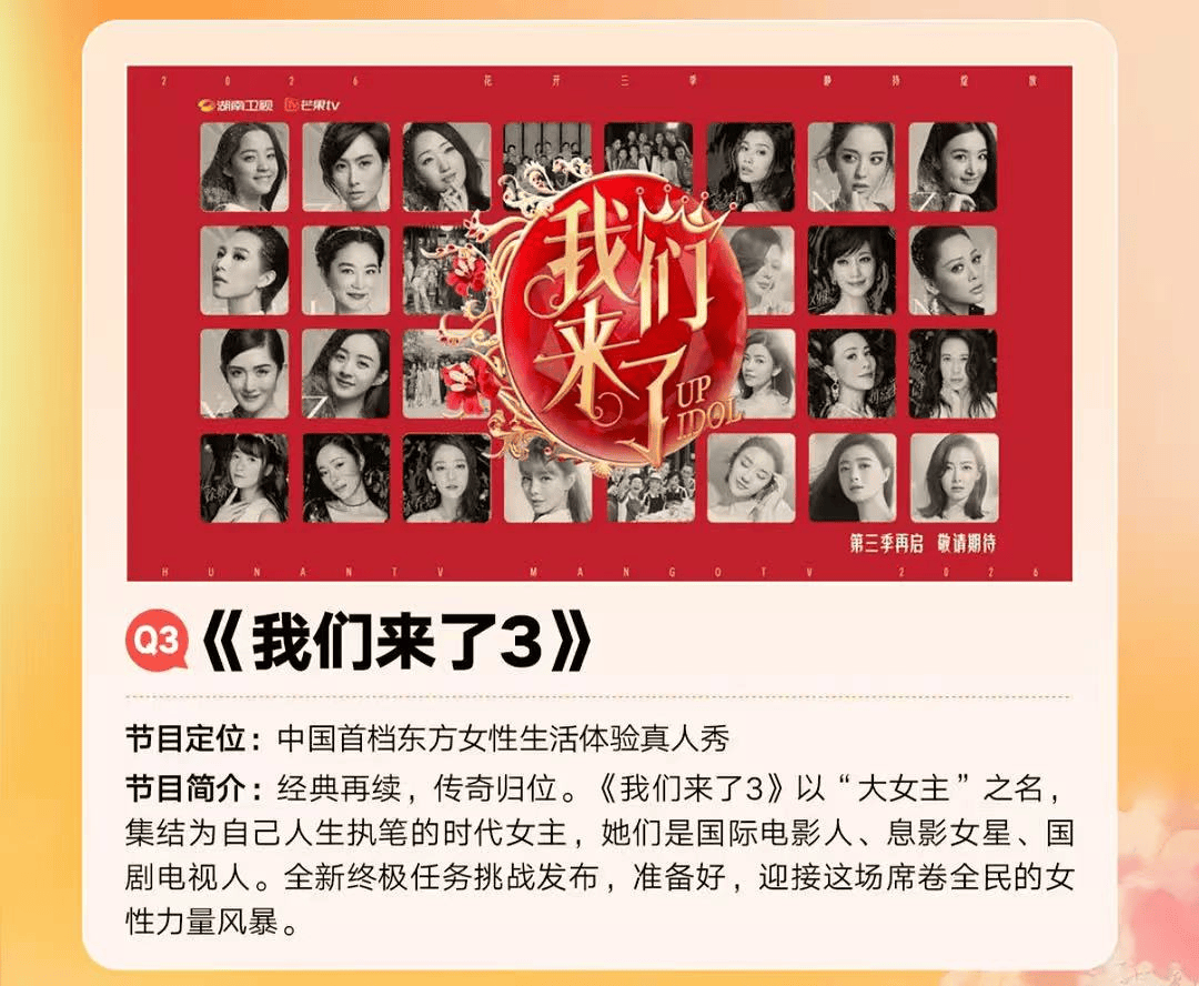 事实上,2026年各个类型都有旧综艺IP重启,从慢综《亲爱的客栈》到音综《中国新生代》到网传的《我们来了》《创造营2026》。兜兜转转,批量“老房新造”的背后,究竟是情怀的胜利,还是创新的困局?